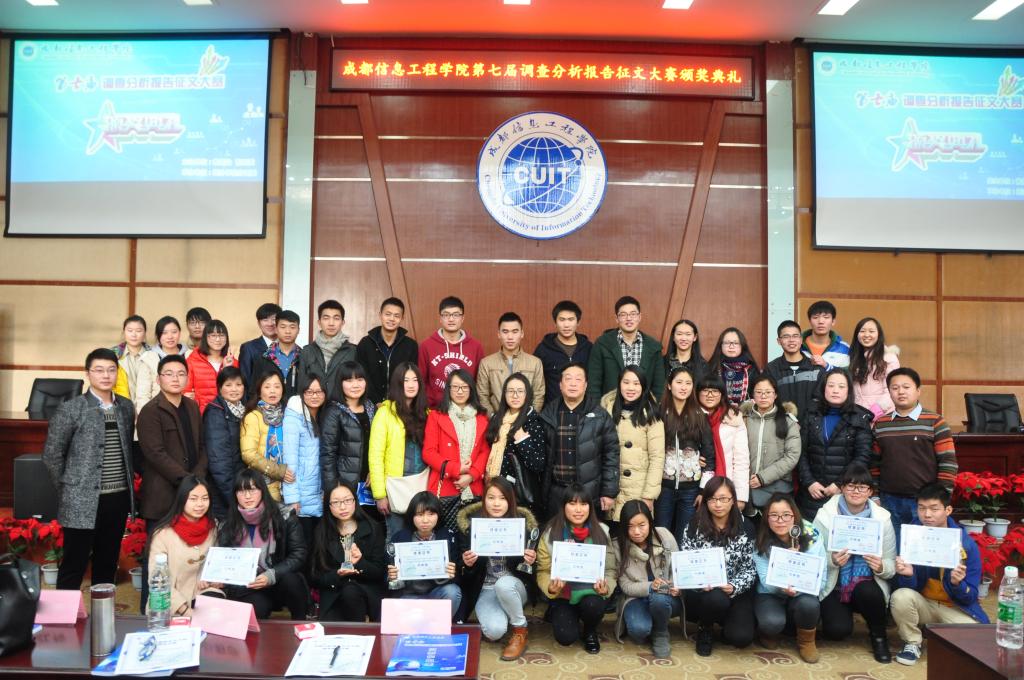 成都信息工程学院第七届调查分析报告征文大赛颁奖典礼于12月19日下午2:00在我校龙泉校区学术报告厅顺利举行。williamhill中国官方网站党总支书记刘全教授、校团委胡敏老师、williamhill中国官方网站彭莉莎教授、龙泉校区各学院分团委书记、williamhill中国官方网站辅导员老师出席参加了此次颁奖典礼。