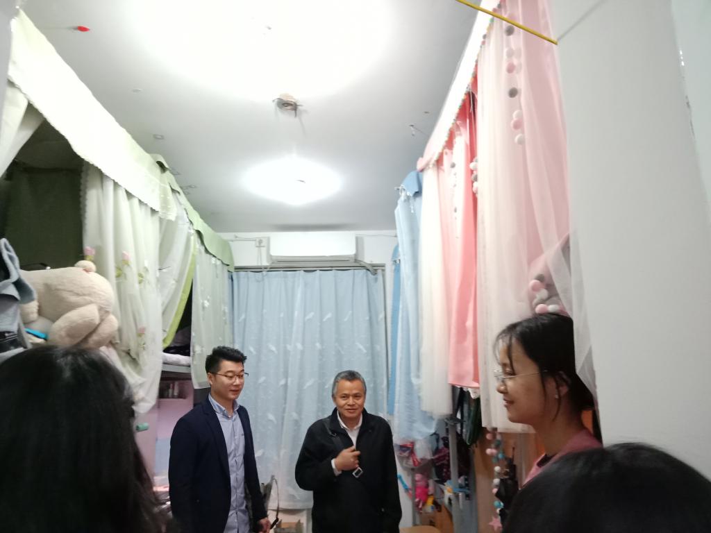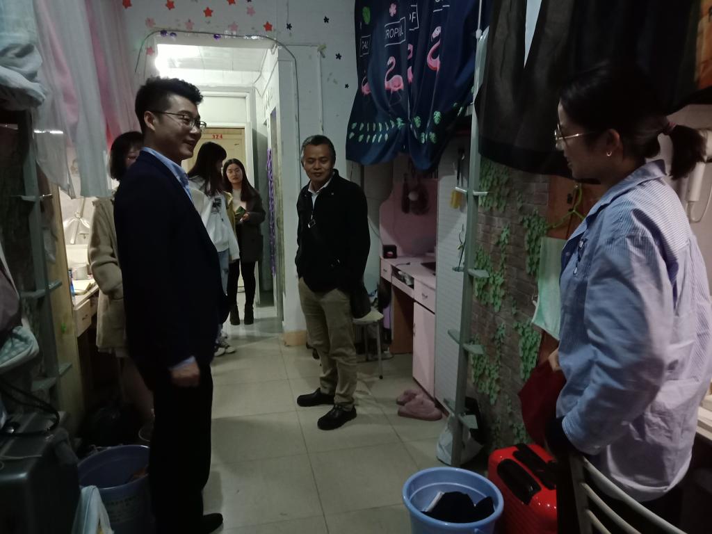 本次检查内容包括宿舍卫生检查与宿舍安全用电。在检查中,李心伟书记以及许瑞老师对同学所做不足之处进行指出,并表扬女生寝室的环境卫生,期望男生多向女生学习。李心伟书记亲切地与学生就如何创建文明宿舍进行交谈,并嘱咐同学们多花点时间学习、切勿沉迷于游戏。最后,他还叮嘱同学们“昼夜温差变化大,要注意保暖”。