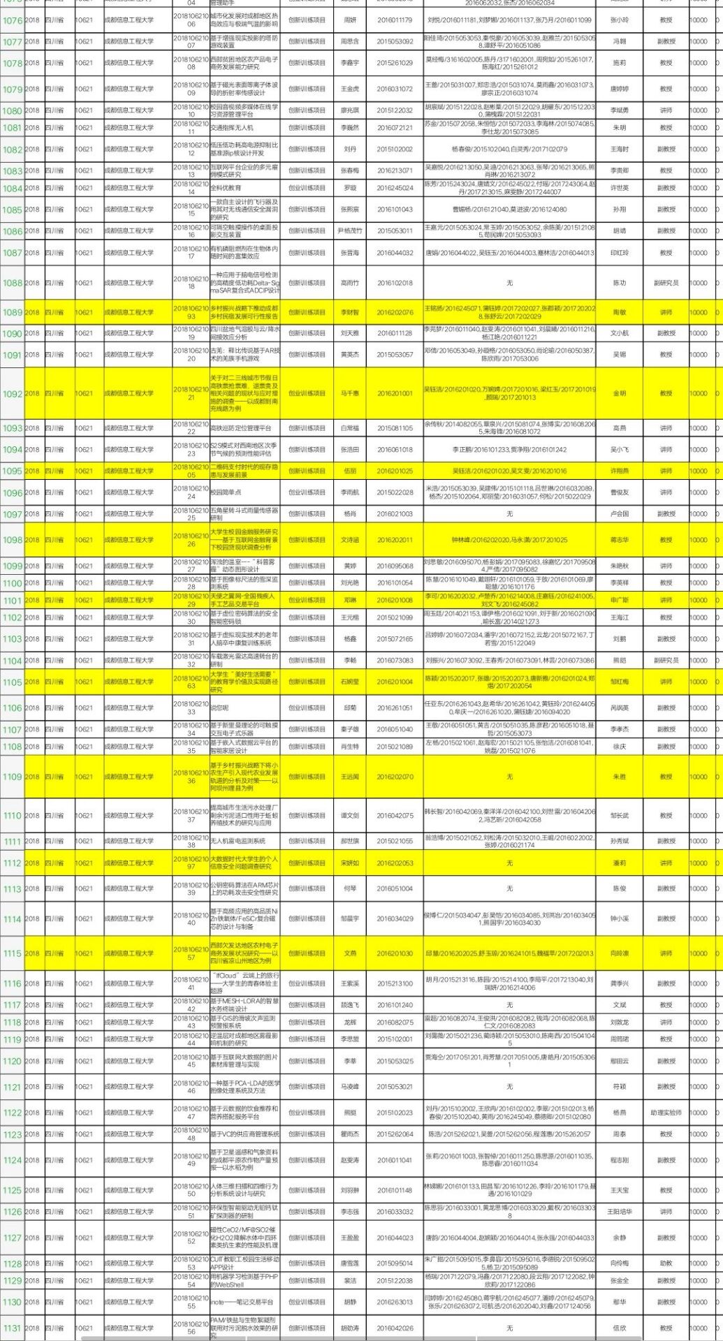2018年9月7日,四川省2018年省级大学生创新创业训练计划项目名单新鲜出炉。名单公布了获得省级立项大学生创新创业训练计划项目8012项,其中创新训练项目5516项,创业训练项目1485项,创业实践项目1011 项。热烈祝贺由我院朱胜、蒋志华、许翔燕、金明、申广斯、向玲凛、邹红梅、陶敏、潘莉指导的大学生创新创业训练项目获得省级立项。