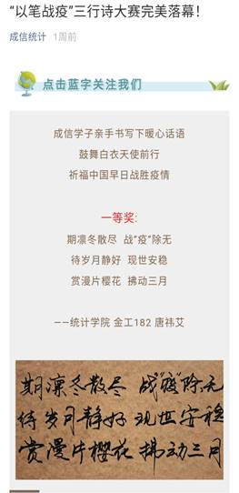 从提交作品的字里行间,可以看出成信学子对奉献者的感激之情,对国家民生实事的关切之情,以及对本次“战疫”必胜的决心。