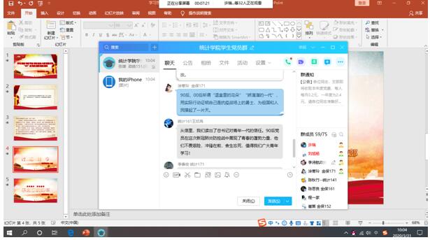 大会第二项由组织委员李诗航带领大家进行线上讨论,分享自己的学习心得,大家展开积极讨论并踊跃发言,16级经济统计学专业预备党员李财智说:“我认为习近平总书记的回信中说提到的精神即:90后党员要起到带头作用,先锋作用。有理想有担当有本领是我们的本质工作,不畏艰险、冲锋陷阵、舍生忘死是我们应有的品质。”17级统计专业预备党员李泰宏说:“习近平总书记给北大援鄂“90后”党员的回信,是对广大奋战在一线的青年党员寄予鼓励和赞扬。“青年兴则国家兴,青年强则国强”,新时代的青年是有责任、有担当、有理想的一代,我们作为青年党员,要努力磨砺意志品质、练就过硬本领,只有这样,才能担当得起时代赋予的重任。”williamhill中国官方网站19届研究生兼班长的张雄谈到:“习近平总书记给北大援鄂医疗队全体“90后”党员的回信中,处处都透露出总书记对新一代青年人的殷切期盼,对他们无私奉献、不畏艰难险阻,奋勇向前精神的肯定与赞赏,对他们将国家安危时刻放在心上的欣赏。当代青年是有责任、有担当、有理想的青年。只要我们齐心协力,紧紧跟随中国共产党的步伐,严格要求自身,共同努力,就一定能够渡过难关。”