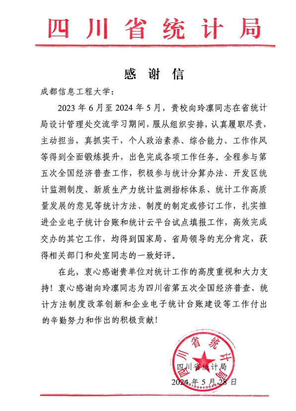 为落实局校战略合作协议,加强局校紧密联系,2023年6月至2024年5月我院向玲凛老师在四川省统计局设计管理处交流学习,期间工作尽职尽责得到省局相关领导和部门一致好评并发来感谢信。