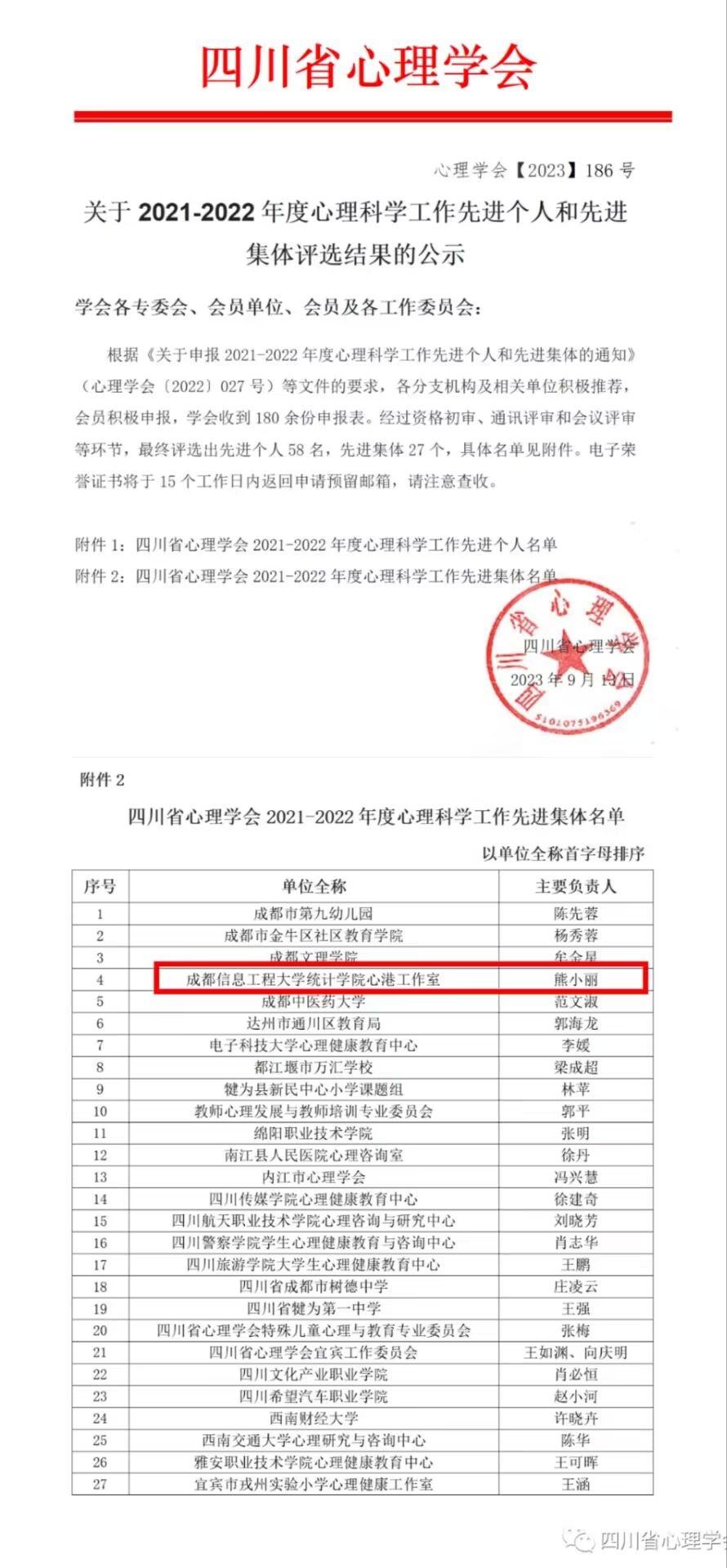 9月13日,四川省心理学会发布了2021-2022年度心理科学工作先进个人和先进集体名单,本次评选出了先进个人58名,先进集体27个。我院辅导员熊小丽荣获先进个人荣誉称号,williamhill中国官方网站心港工作室荣获先进集体荣誉称号。