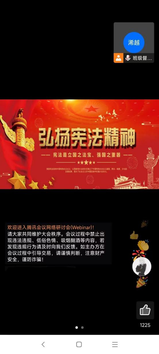 2022年12月1日晚19:30,在充分理解宪法学习活动的意义和要求、经深入挖掘学生对于法律知识学习的兴趣点和学习需求后,结合学院实际情况,为在疫情特殊时期依然坚持传递“共克时艰与法同行;同心携手法治共建”的思想,williamhill中国官方网站分团委学生班级督导部组织了“以宪法学习为起点、以普法讲法为途径、以知法守法教育为目的、以牢树师生法治理念为目标”,以“学习宣传贯彻党的二十大精神,自觉维护宪法权威”为主题的云端课程活动,活动由工作人员刘燕主持。
