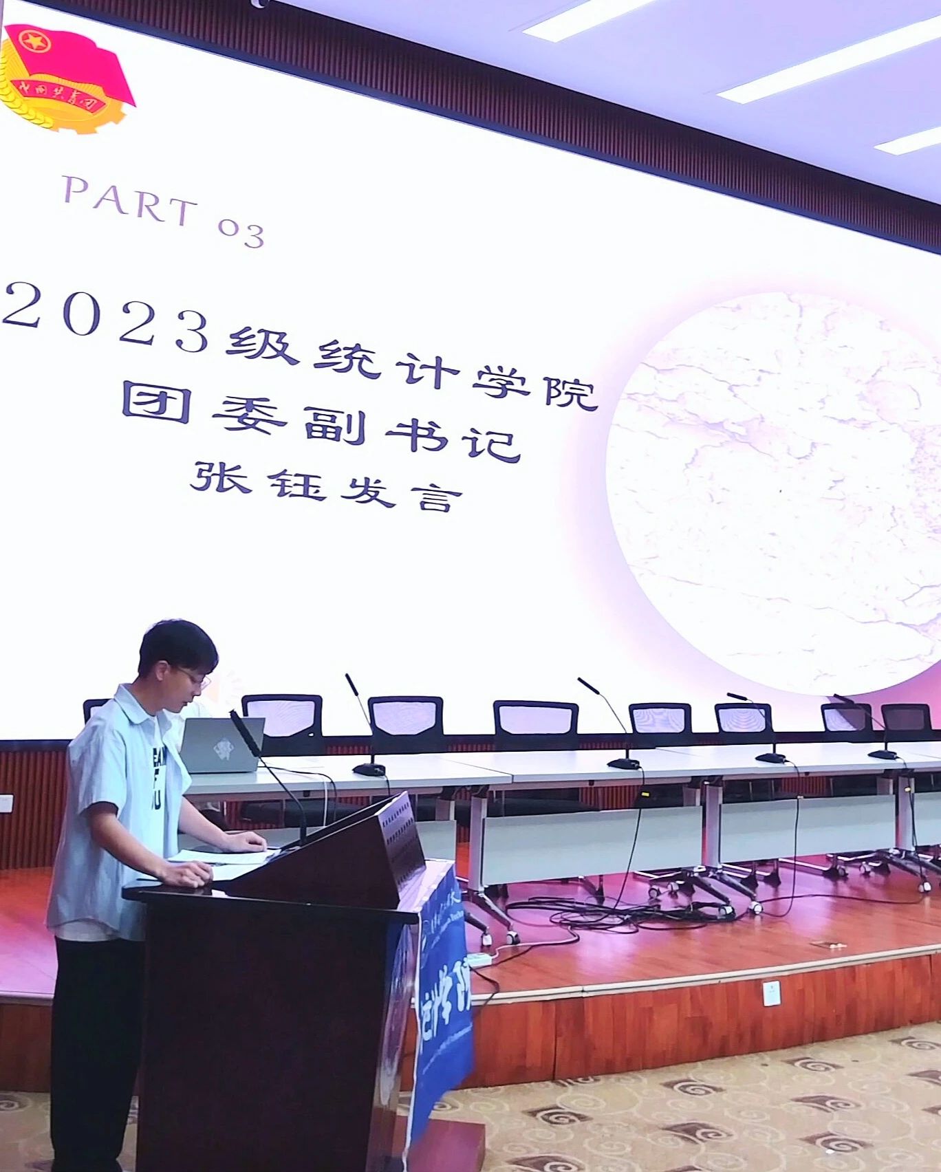 大会第四项,2023级团委副书记张钰发表感言。张钰同学首先代表上一届团学组织成员,对校领导、老师和同学们表示感谢,回顾了过去一年的经历和成就。后强调了团学组织的使命与价值,最后对未来的发展提出了具体的建议与期望。
