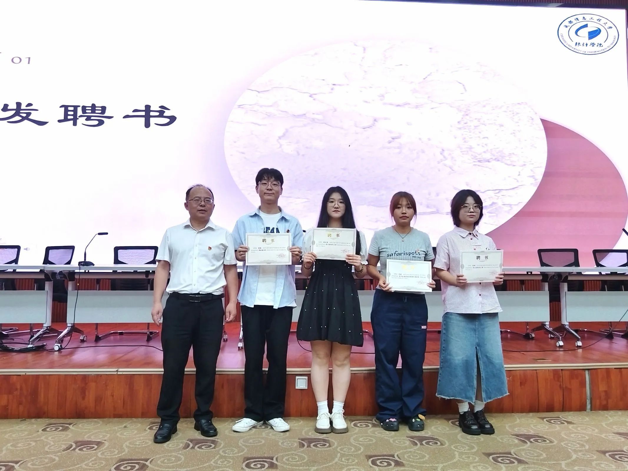 大会第二项,颁发聘书。金明书记为2023级团学组织主席团颁发聘书,张继成老师为各部门负责人及各社团协会部级颁发聘书。