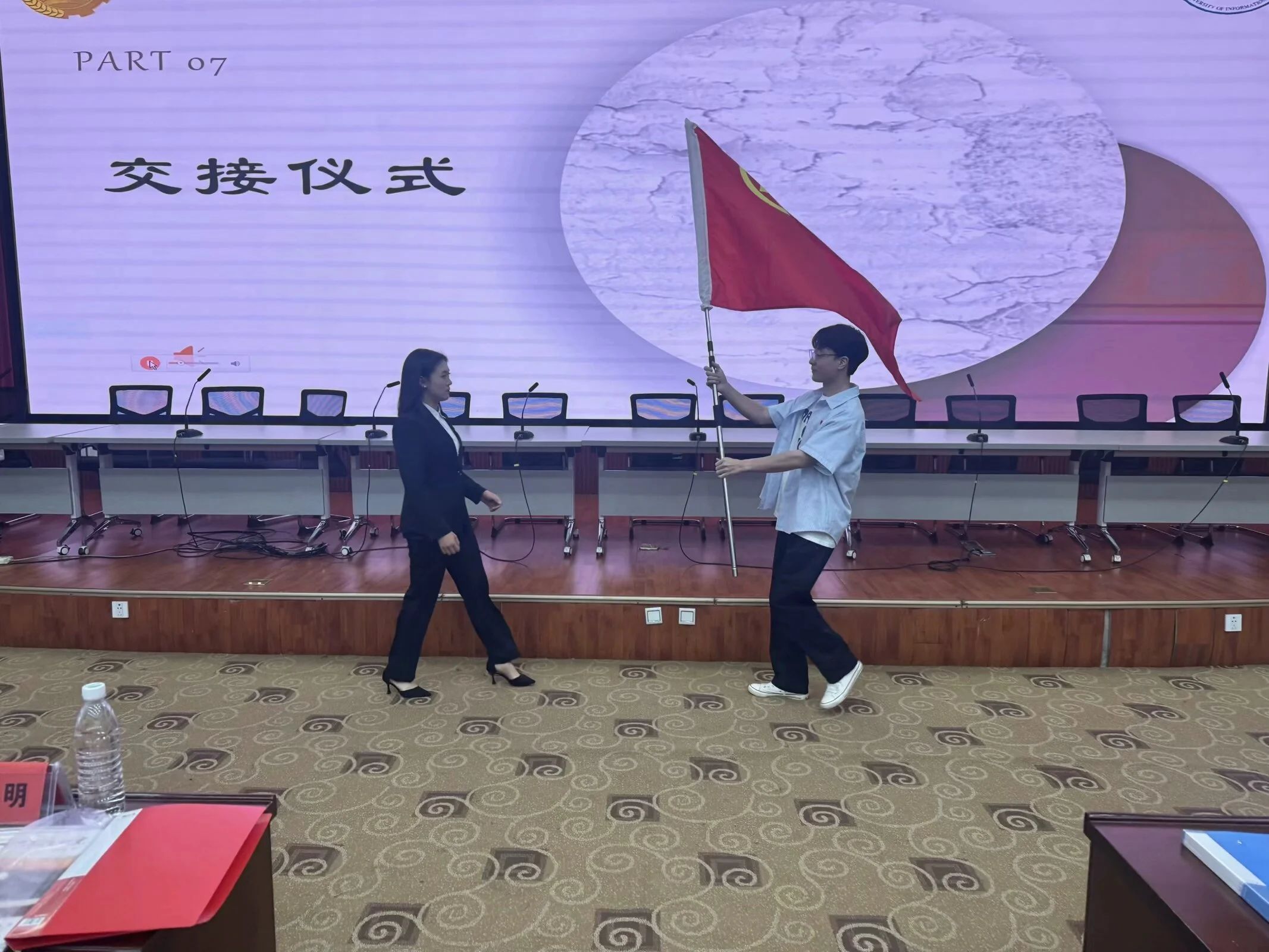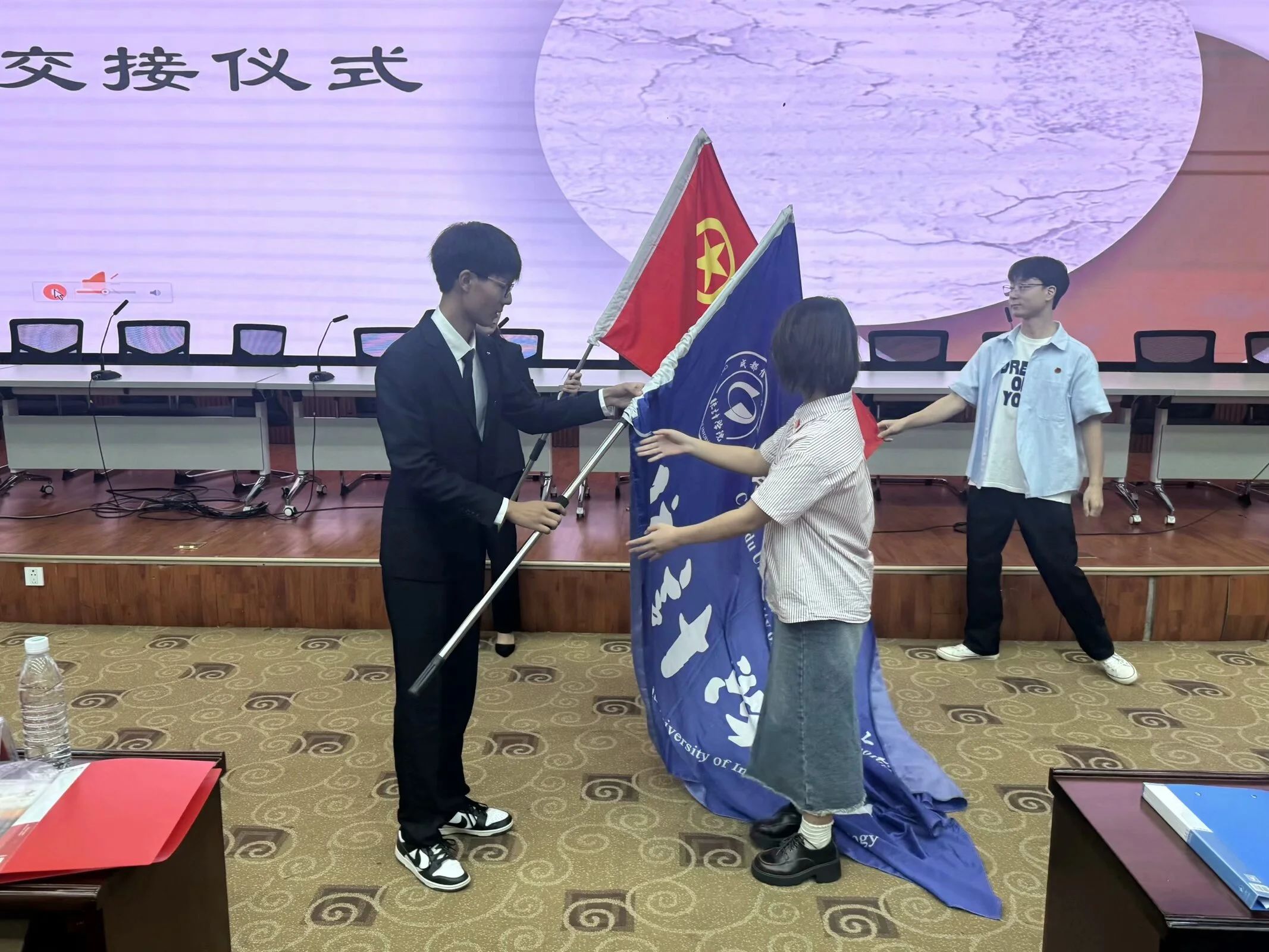大会第七项,交接仪式举行。上一届团学组织主席团将象征着使命与责任的团旗和院旗交给新一届主席团,完成了责任的交接。
