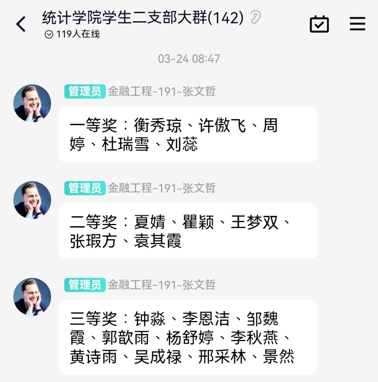 活动尾声,支部委员张文哲公布了获奖情况,恭贺衡秀琼、许傲飞、周婷等支部成员取得了优秀成绩,同时也给支部其他成员树立了榜样,希望能在接下来的学习中继续提升支部成员的党性修养,将党的要求和精神内化于心、外化于行。