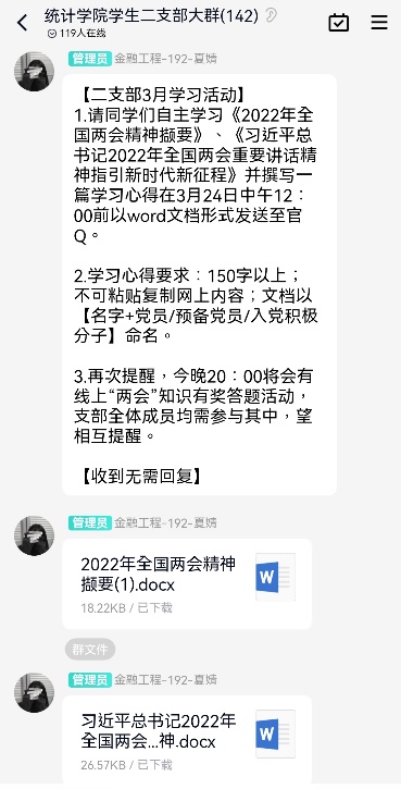 活动开始,主持人夏靖线上发布活动流程和学习文件,请支部成员们自主学习《2022年全国两会精神撷要》等,并在阅读学习后撰写一篇学习心得。