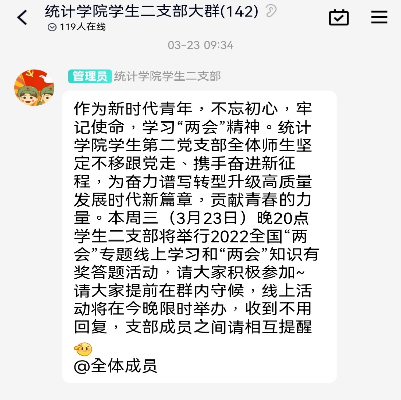 在春天召开的两会,寓意着希望与生长,为了更加深入了解两会内容、学习两会精神,williamhill中国官方网站学生第二党支部于2022年3月23日晚举办了线上“专题学习活动”和两会知识答题活动。线上活动主持由支部成员夏靖担任,本次活动面向学生第二党支部的全体成员,大家一起学习、一起进步,坚定不移携手奋进新征程。