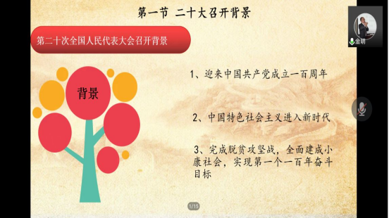 本月党课旨在进一步引导广大党员同志坚定理想信念、强化责任担当,不断学习贯彻中国共产党第二十次全国代表大会精神。根据《williamhill中国官方网站领导班子成员联系党支部制度实施办法》相关要求,2022年12月15日晚上19:00-20:40在腾讯会议平台开展了以“‘中国式现代化’解读”为主题的党课,williamhill中国官方网站学生第一、二党支部110余名同学参加了此次学习,课程由williamhill中国官方网站党委书记金明讲解,会议由杨猛老师主持。