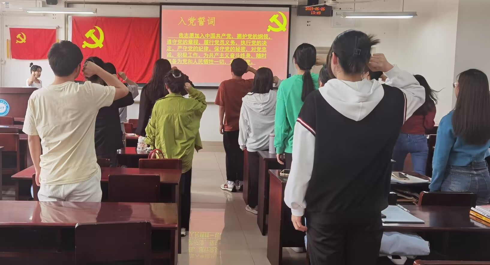 大会第八项,进行入党宣誓。支部委员何文秀同志带领吴诗雨等13位同志进行入党宣誓,表明了他们对党的坚定信念和为党的事业奋斗终身的决心。至此,本次金融系学生党支部接收中共预备党员大会圆满结束。
