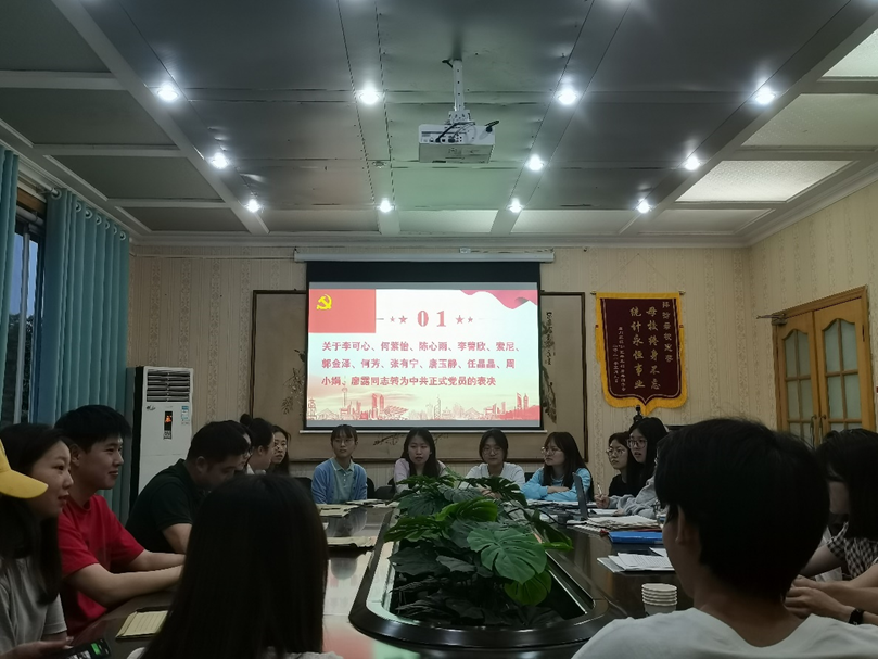 会议第一项议程:预备党员转正。由上期预备党员进行发言,总结在预备期内的思想学习、生活工作等方面情况。并就转正的阶段性转变进行表态,以及在转正之后的思想行为该如何提高进行表态。在汇报结束之后,由支部正式党员对预备党员预备期的表现进行点评,并对于其转为正式党员进行表决,最终全票通过唐玉静等同志按期转正的申请。并由党支部书记杨健雄老师宣布表决结果。