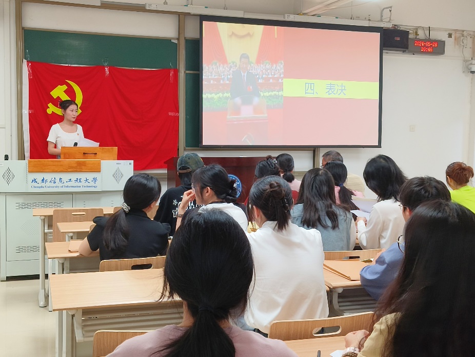 接下来,邹魏霞同志代表支部委员会宣读了支委会审议意见,同意魏志俣等9名同志加入党组织。与会全体党员对是否同意接收这9名发展对象为预备党员进行民主讨论和无记名投票,最终21票通过,0票弃权,0票反对。党支部书记熊小丽老师宣读支部大会决议,同意接收魏志俣、张亚超、孙诗清、赵宇豪、徐青春、苏露、廖嘉琦、丁若嘉、谯钰彦这9名发展对象为中共预备党员。并希望他们以预备党员作为崭新起点,更加严格地要求自己,加强对党的理论的学习,在工作中踏实履行起党员的职责,严以律己,不忘初心!