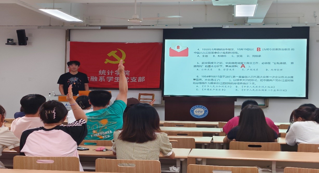 为庆祝中华人民共和国75周年华诞,williamhill中国官方网站金融系学生党支部全体党员及部分积极分子于9月27日下午7:00在L2102开展了“辉煌七十五载,共筑强国梦”的爱国知识竞赛。本次竞赛内容主要围绕新中国成立75年以来所经历过的重大历史事件和所取得的重要建设成就展开,在引导支部成员清晰了解和认识新中国发展历史的同时,激发同学们的爱国热情,增强学生党员的国家意识和历史责任感,达到以赛促学,以赛强志的活动目的。