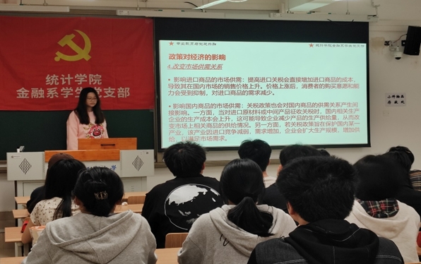 会议开始,张也薇同志就目前复杂多变的国际贸易形势、特朗普政府实施的增加关税政策导致的全球经济格局变动的背景作了简要介绍,并指出在此背景下,我们作为金融系的学生党员,关注时政热点、聚焦关税问题、研探金融政策、思考经济社会发展和当前自身学习储备的方向性、重要性和必要性。