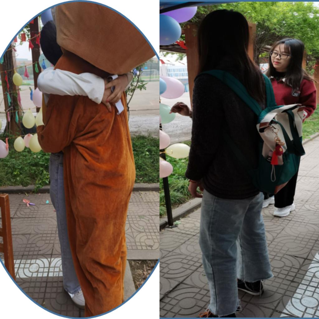 线下活动:工作人员在纸条上写下有关本次活动主题的赋能话语,同时在纸条右下方附上一个小礼品的名称(尖叫鸡、手机支架、捏捏乐、文件袋、小本子等),并将其装入气球,参与活动的同学可以随机选择一个气球将其扎破,领取纸条和对应奖品(纸条可留作纪念),最后可与穿玩偶服的工作人员拥抱,以此接纳爱和传递爱。
