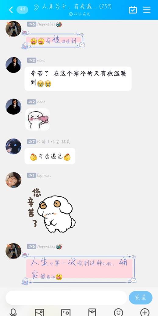 投递到官Q和公众号的留言我们也一一认真回复,信件和留言里,心与心的触碰与抚慰,令我们触动、感动;活动中 “爱的抱抱”,不仅为寄情旧友和家人的新生们提供了自由拥抱的机会,更创设了让他们敞开心扉,感受爱与温暖的美好校园记忆;