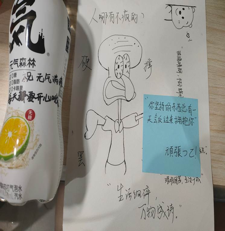 大家通过写信或者画画等方式表达出了自己的各种情感、情绪,活动结束后我们工作人员也一一将信和画送到同学们指定想送人的手里,并且我们挑选出了部分值得鼓励的同学送上我们的奖品——元气森林一瓶,希望参与活动的大家都可以元气满满的!